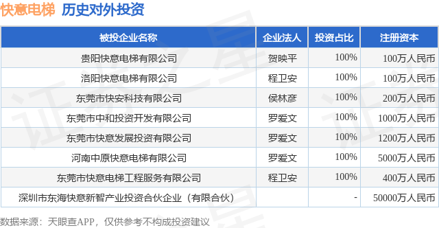 本站消息,根据天眼查APP显示,快意电梯(002774.SZ)新增一起对外投资事件,被投资公司为深圳市东海快意新智产业投资合伙企业(有限合伙),法定代表人,投资占比为-。该公司从事资本市场服务,注册资本为50000万人民币。目前,快意电梯共存在对外投资8项,详见下表: