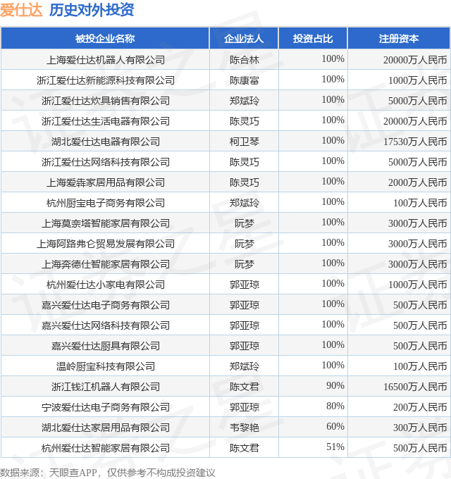本站消息,根据天眼查APP显示,爱仕达(002403.SZ)新增一起对外投资事件,被投资公司为杭州爱仕达智能家居有限公司,法定代表人陈文君,投资占比为51%。该公司从事家具制造业,注册资本为500万人民币。目前,爱仕达共存在对外投资23项,投资占比前20的项目见下表: