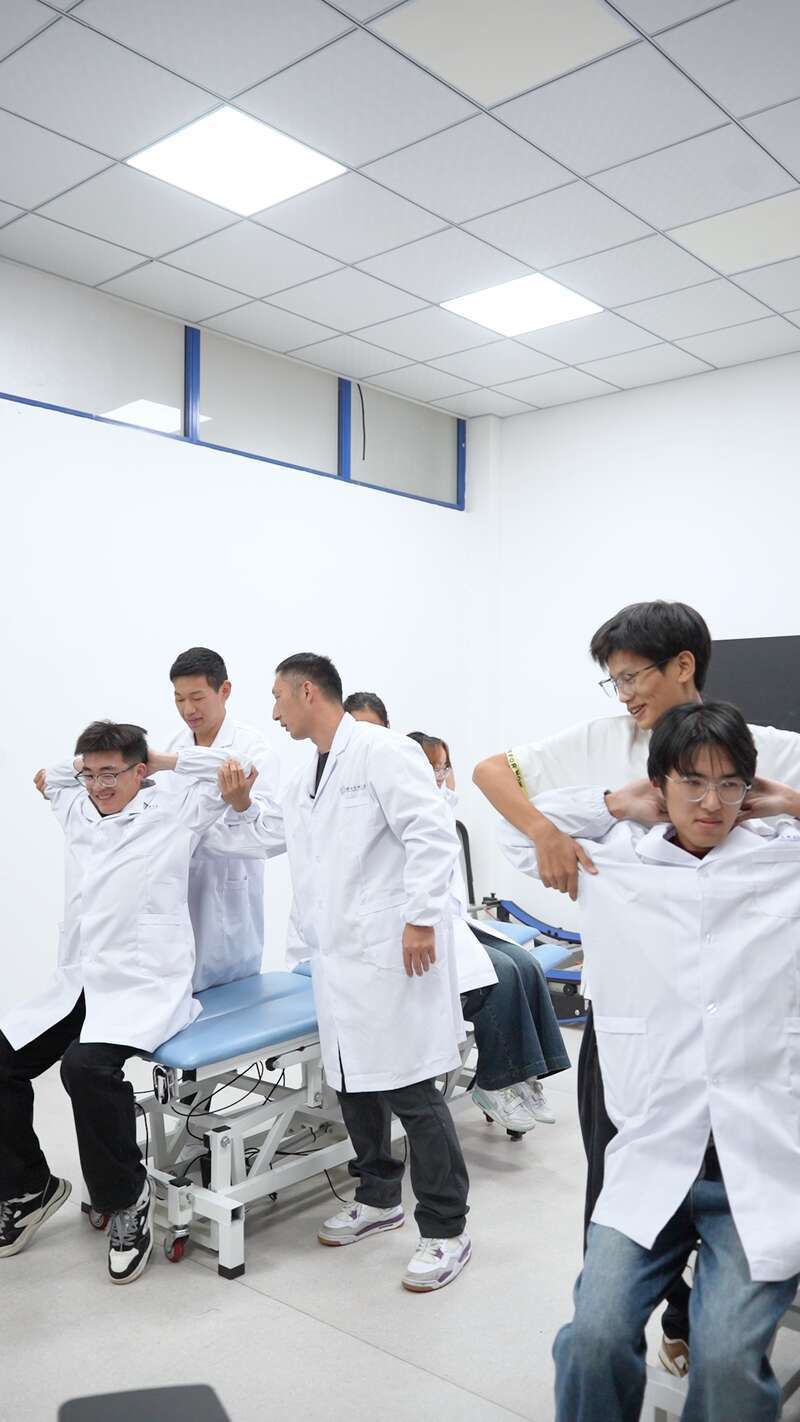 不仅能进行步态训练、运动康复训练,这里还能进行赛前运动风险筛查、健身前运动基础评估等,其中肌力初筛等项目收集数据还是科研所需的第一手材料。对于该校运动康复专业的学生来说,这里是教学楼之外的“课堂”。工坊内配备的艾灸、筋膜刀、五禽戏教学图谱等,对学生来说不仅是日常会用到的康复器材,还是趁手的专业教具。
