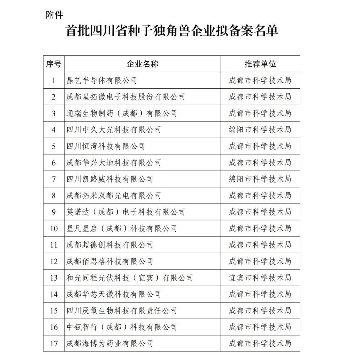 11月18日,四川省科学技术厅近日公示了首批33家“种子独角兽”企业拟备案名单。这是自今年7月《四川省种子独角兽企业备案培育办法(试行)》发布以来,首次遴选出的高潜力科技型初创企业。名单显示,超过九成企业来自成都,且集中分布在半导体、生物医药等领域。